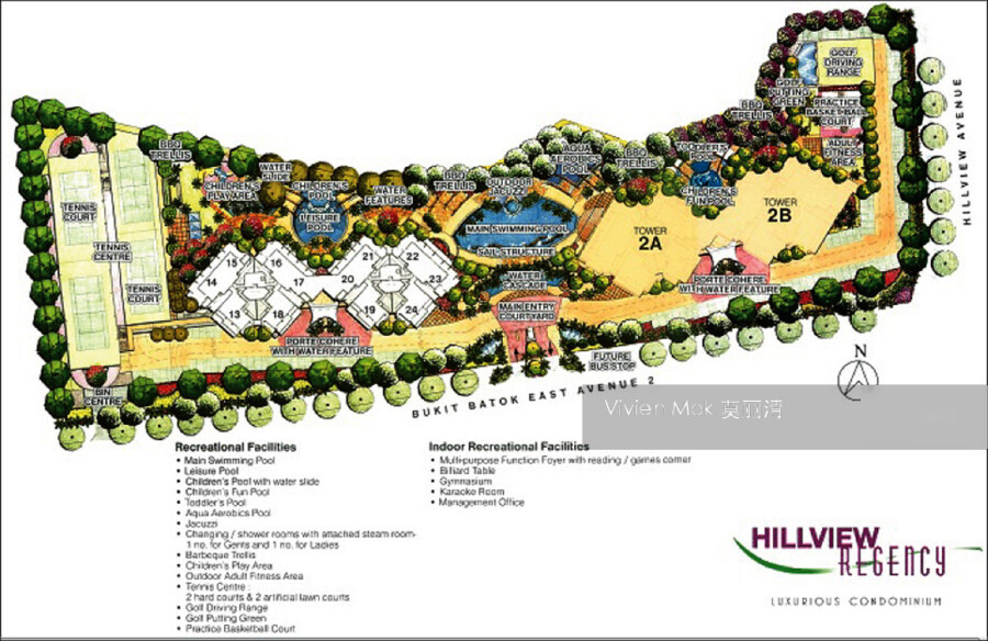 There are 6 Swimming Pools, 4 Tennis Courts, a Golf Driving Range and a Half Basketball Court. Hillview Regency is a Kids Friendly development as most of the facilities are located on Level 2 and away from the Driveway.