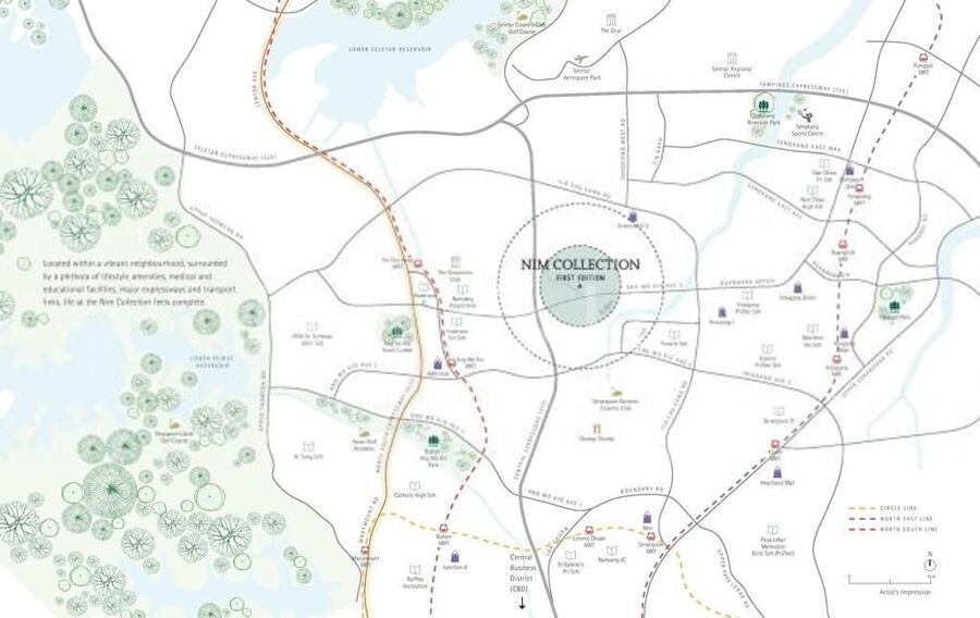 Nim Collection is accessible at Ang Mok Kio Avenue 5 via the Central Expressway (CTE). It also could be reached through Nim Rd via Seletar Rd, Yio Chu Kang Rd and Sengkang W Rd that also connected with Seletar Expressway (SLE) & Tampines Expressway (TPE).