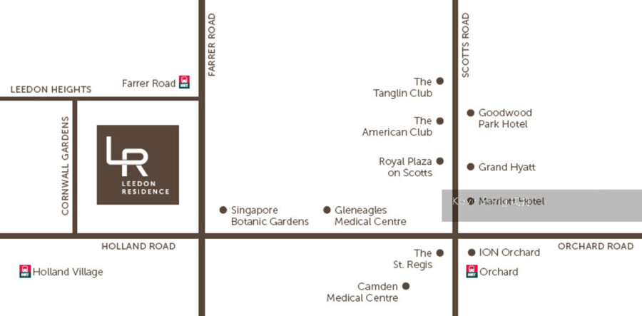 Situated on an expansive 4.9 hectare site next to the Leedon Park Good Class Bungalow enclave, Leedon Residence is one of the largest freehold residential developments in District 10. Residents will benefit from being within walking distance to the Farrer Road MRT station and the convenience of being in close proximity to popular commercial and lifestyle centres such as Holland Village, Dempsey Hill and Orchard Road. The nearby internationally renowned Singapore Botanic Garden provides a park area for residents.