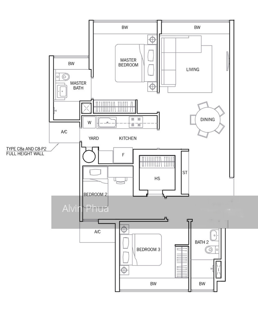 3 bedroom + H/S, 990 sq ft. Mid floor, corner unit.